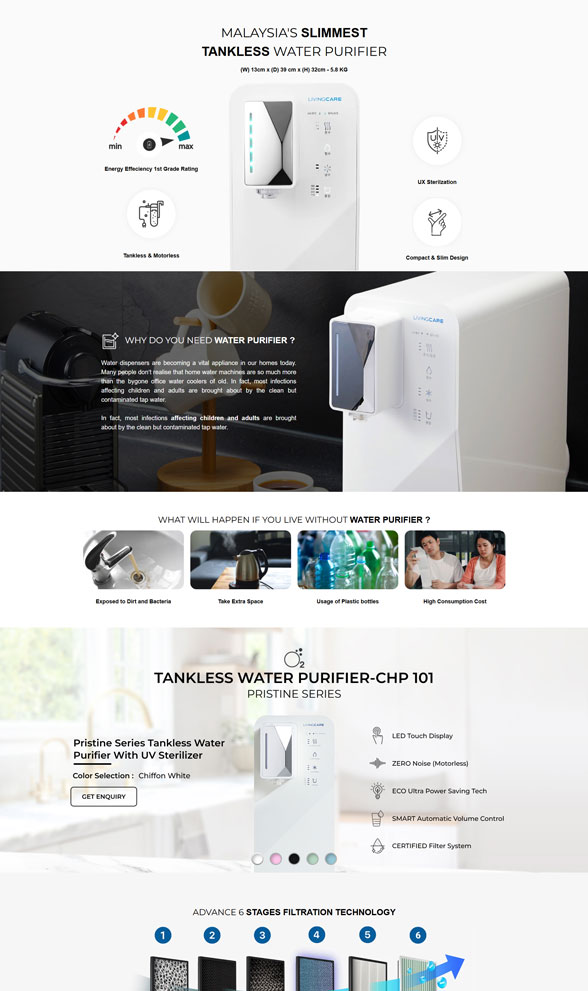 LivingCare2U is a Malaysian supplier specializing in modern tankless water purifiers designed for home use. Their main product features a slim, compact design with instant hot and cold water, a multi-stage filtration system, and quiet, motorless operation.